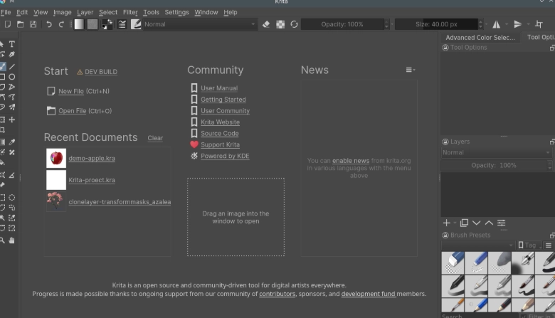 1, 首次启动Krita时,窗口中央不会马上呈现画布视图,取而代之的是欢迎屏幕。若要打开画布视图,需要新建或打开一个图像文件。