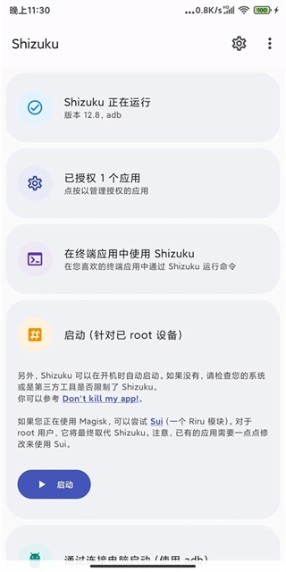 点击启动按钮,稍作等待就能让shizuku授权应用正常运行了。