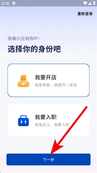 在身份选择页面,点击选择我要开店,点击下一步。