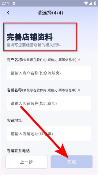 进入店铺资料完善页面,把相关信息填写完毕后,点击“完成”按钮提交店铺资料,这样就走完开店流程了。