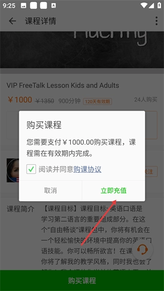当【购买课程】的弹窗弹出后,点击其中的【立即充值】按钮,即可完成课程的购买流程。