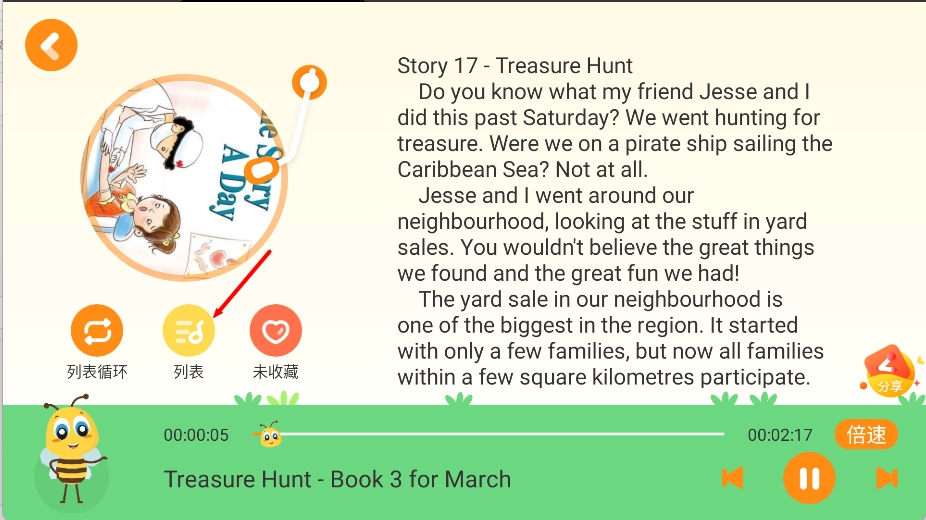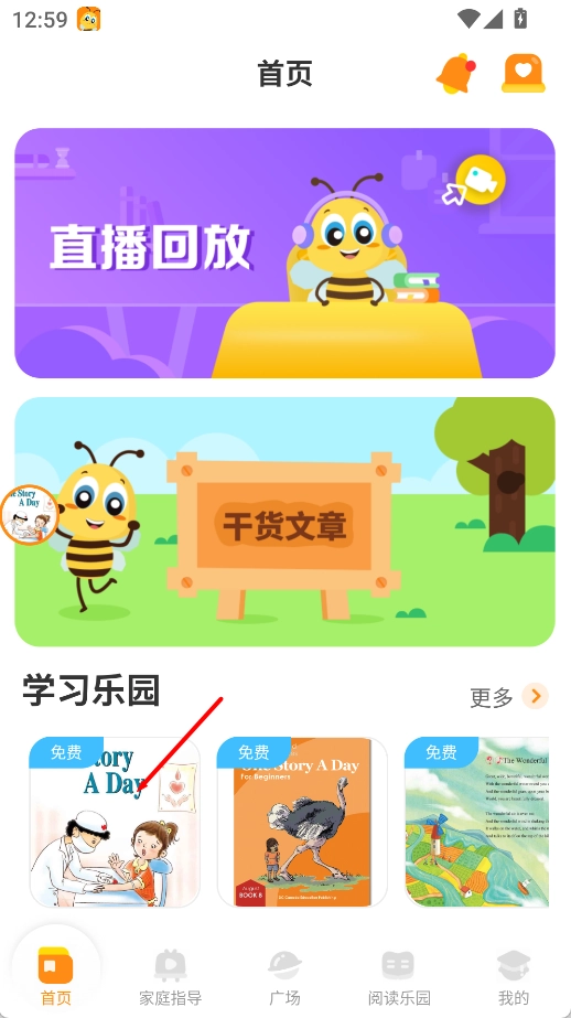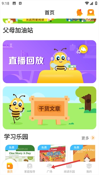 打开安妮花绘本阅读馆,在首页的“学习乐园”板块里找到文章《The Story a Day》并点击,即可进入该文章的阅读页面。