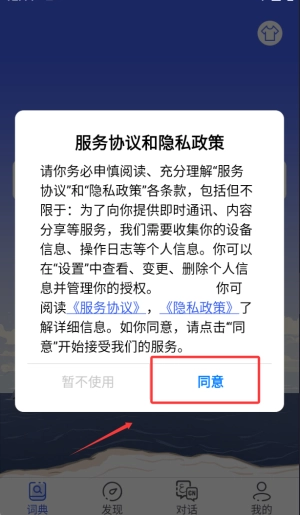 1、首次打开应用时,需仔细阅读并确认用户协议条款,点击同意按钮后就能进入功能主界面,开始使用各项服务。