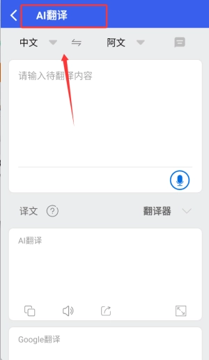 2、选择语音翻译功能后,可借助麦克风输入中文或阿拉伯语内容,系统会自动识别并实时将其转换为目标语言的文字结果。