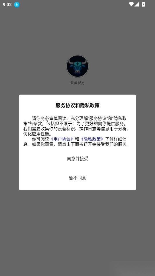 1. 打开软件,阅读“服务协议和隐私政策”后,点击“同意并接受”按钮进入下一步。