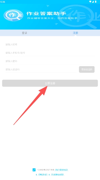 1、启动软件进入注册页面,依次填写昵称、手机号、密码和验证码,随后点击“立即注册”按钮。