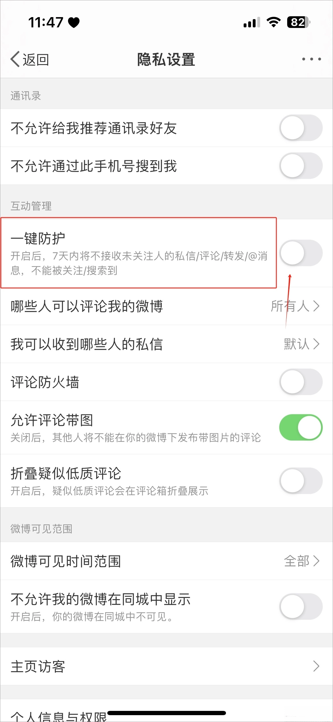 3、最后,进入隐私设置页面,点击开启一键防护的开关,这样对方就无法查看我关注的人了