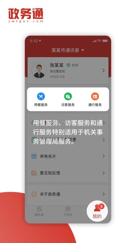 全国政务通App是专门为政府机关和事业单位开发的应用,能为您带来更便捷的移动办公体验。您可以快速找到同事,通过一键操作实现协同办公,还能享有用餐、访客、通行等丰富多样的服务!