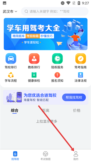 进入【找驾校】页面后,能看到【驾校排行】【教练排行】等功能选项,点击底部的【我的】按钮即可进入个人相关操作页面。