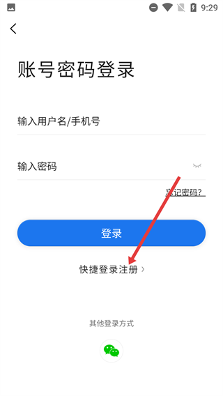 3、在【账号密码登录】页面,若不想通过账号密码登录,可点击【快捷登录注册】选项,选择相应方式完成登录或注册操作。