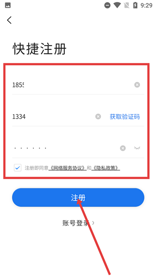 4、进入【快捷注册】页面后,填写【手机号】【验证码】等信息,勾选相关协议,随后点击【注册】按钮,即可完成账号注册流程。
