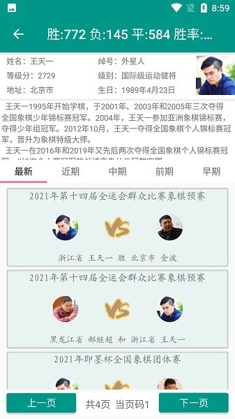 1、棋谱库收录了十万部大师对战的全局谱,涵盖象甲联赛、全国智力运动会、全国象棋个人锦标赛、国际象棋赛事等二十多个不同类型的重要赛事。