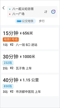 6、您可在主界面底部选择公交、地铁、步行三种方式规划路线,输入起点与终点位置后,搜索所需路线。例如,这便是公交路线的搜索示例。