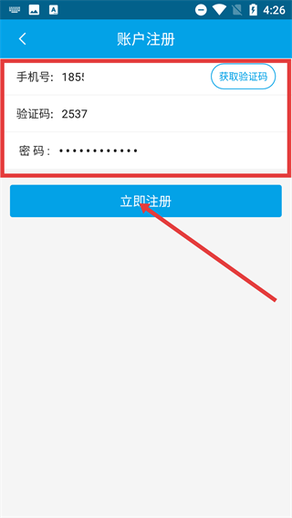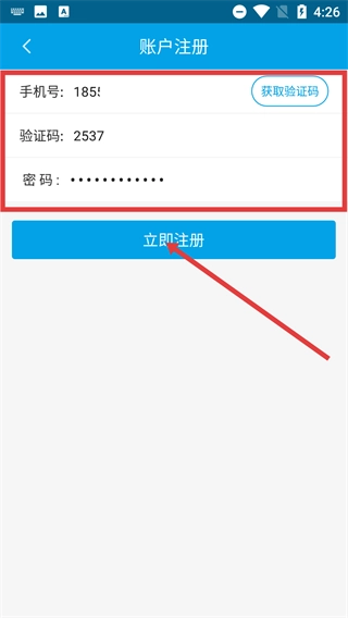 4、在账户注册页面依次填写手机号、验证码与密码,随后点击【立即注册】按钮,即可完成注册流程。