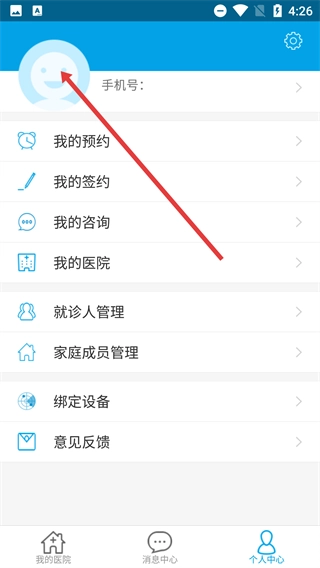 1、在景联家庭医生首页找到右下角的【个人中心】按钮并点击,即可进入个人中心页面。