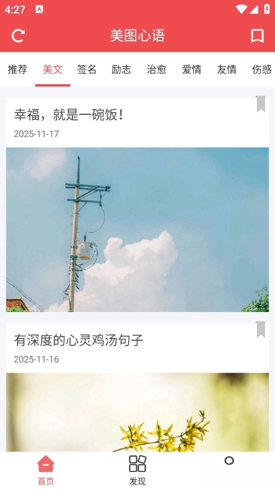 3、美文板块的内容丰富多元,涵盖了散文、名人名言、段子以及心灵鸡汤等各类文章资源。