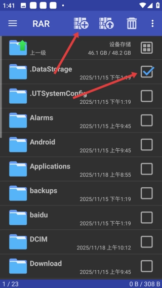 1、打开RAR界面后,选择【目标文件夹】,接着点击界面顶部的【压缩按钮】,即可进入压缩选项页面。