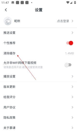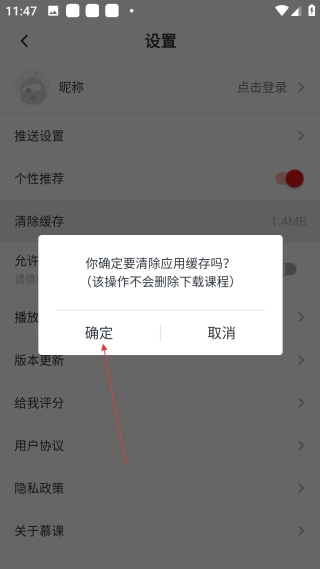 3、进入设置界面后,找到并点击【清除缓存】选项,此时会弹出清除缓存的确认提示框。