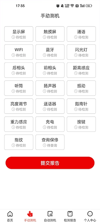 2、点击手动测机,选择你的手机能使用的功能,然后点击提交报告;