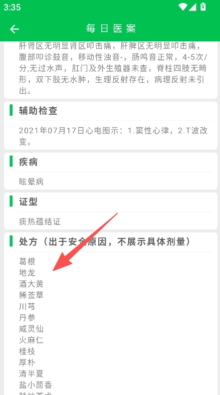 1、进入互动讨论区,点击每日医案板块,即可查看包含主诉、证型、处方等信息的详细病例内容。