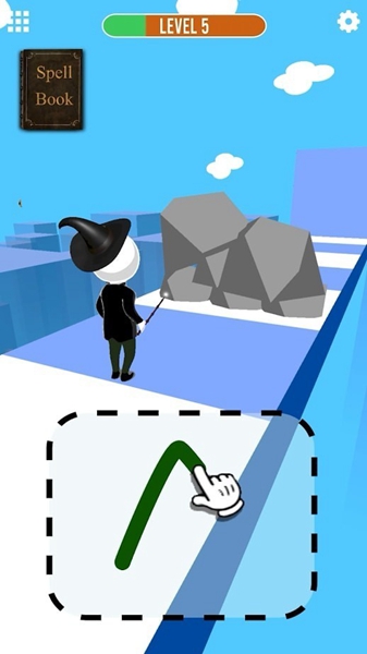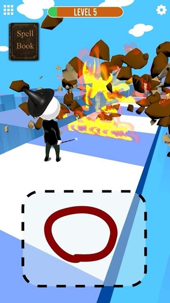 2、玩家扮演魔法师在关卡中会遇到很多的障碍物,玩家需要控制法师画出道具来破坏障碍物,快速的跑到终点就可以获得的丰富的报酬。