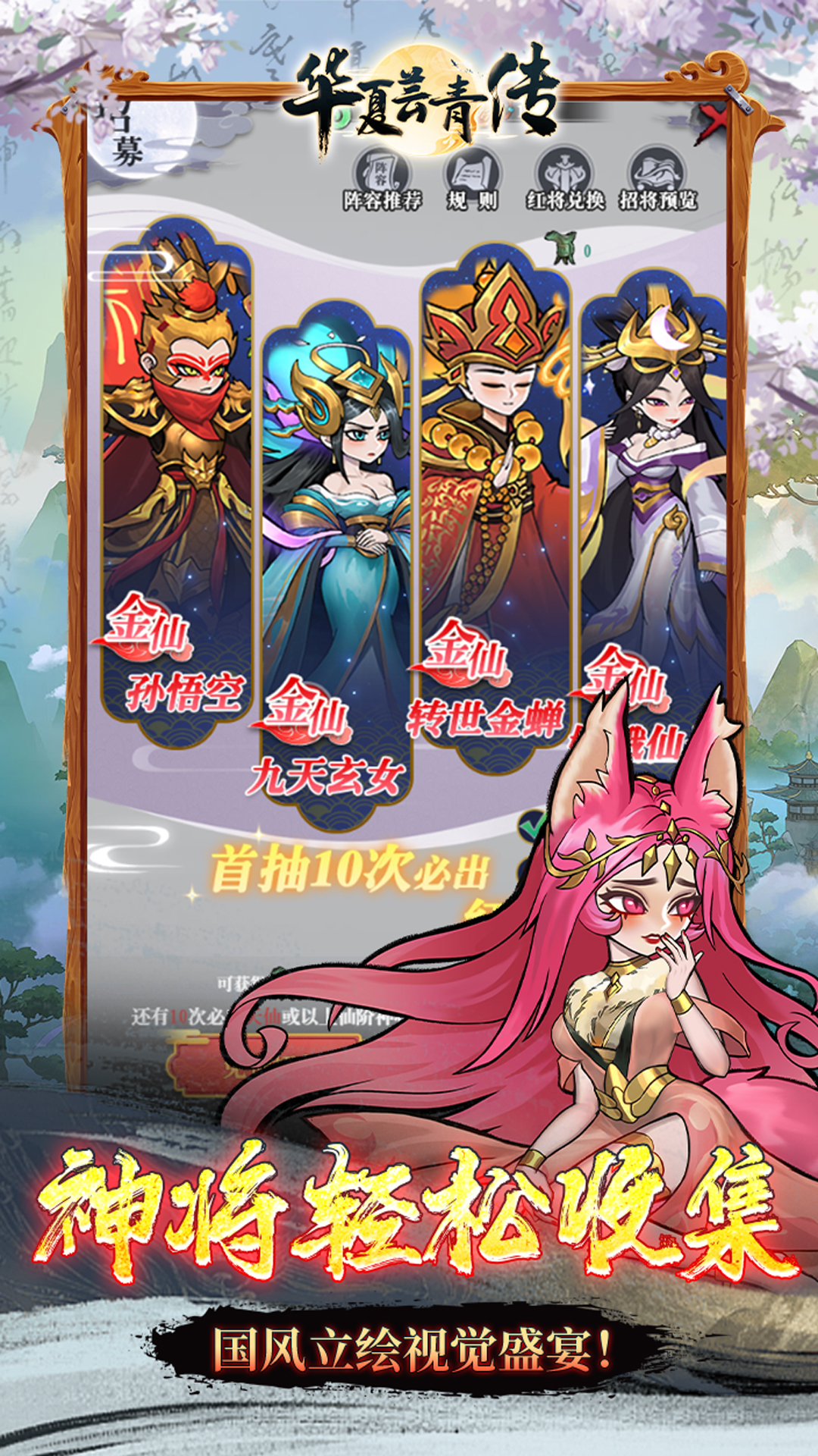 华夏芸青传是一款神话仙侠秀修真战斗角色养成类型的游戏,在游戏中以仙侠修真为背景,玩家可以扮演修真者,在游戏中探索神秘的修真世界,玩家可以通过收集、培养和升级神将,组建自己的最强阵容,进行各种战斗挑战,利用策略和智慧来制定战略,战胜敌人,还有日常副本活动,玩家可以参与战斗、任务和挑战,获得经验和资源。
