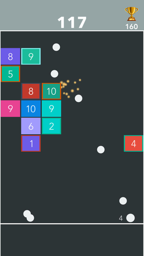 非常好玩的弹射,小球在方块之间反复撞击,数字小的方块都被击碎了。