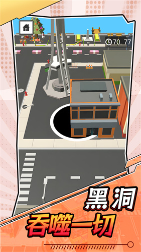 1、创新黑洞操控玩法:玩家扮演黑洞,通过移动吞噬场景中的物体不断扩大自身;