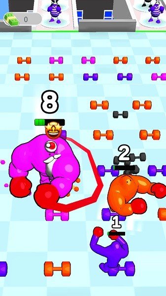 1、控制肌肉男不断晋级,通过消灭其他角色、收集资源来进化自己;