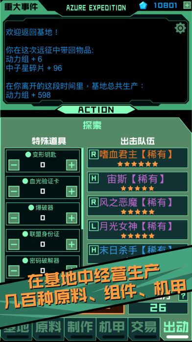 在基地探索,寻找新的机遇,打造最新科技的机甲,守卫好你的疆土。