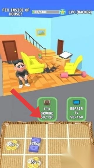 1、展现房屋修复玩法,画面里存在修复地面(花费0/120)、修理电视(花费0/160)等修复任务提示,玩家能够开展房屋修复操作。