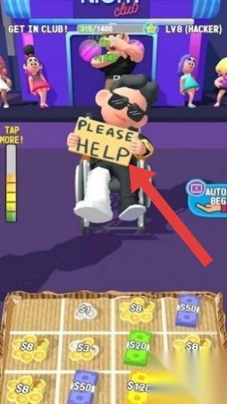 2、画面里的角色坐在轮椅上,举着写有“PLEASEHELP”的牌子,所处场景为俱乐部,同时还有“GETINCLUB!315/1400”(其含义为进入俱乐部进度315/1400 )这样的信息。玩家在此场景下,能够体验到诸如乞丐求助之类的模拟玩法。