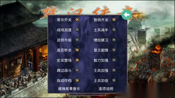 5、禁卫添加规则:在《楚汉群英传》的困难模式中,战斗时敌方部队会自动增添一名武将,该武将以我方武力值最高者为原型,命名为禁卫军。若玩家选择困难模式,却不希望出现禁卫军,可取消此选项。