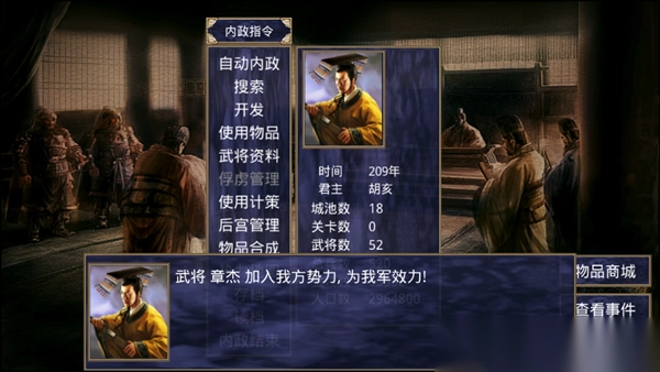 8、史实情境呈现:部分武将对特定人物怀有忠诚之心,或与他人存在血缘联系,这些因素会对招降、离间以及搜索等行动的成效产生影响。举例来说,倘若你俘获了张飞,而刘备并不在你阵营之中,那么张飞是不会向你归降的。