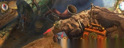 1. 第一步,把鱼放置在左边的操作台上,点击侧面,打开盖子并连接红蓝电线。随后,转动右边的转盘,获取【充电的鱼】。在右边的操作台上,你能发现【研磨剂】。走出房门后,借助梯子爬上雕像,对顶端的金色机器使用研磨剂和螺丝刀,从而得到【螺旋桨】。