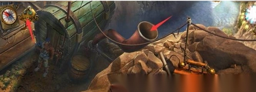 5. 用剪刀从右侧渔网处获取【网】,接着查看道具栏勺底,按顺序使用【网】和【线圈】,从而得到【勺网】。将【勺网】用于浮标上的乌鸦,即可得到【房子钥匙】。与男孩交谈后,拉动机器拉杆把小船放下,登上船后,在船右侧油箱盖子上能找到【雕像1】。拉动红色箭头左侧的把手,再使用扳手,就能拿到发动机里的【泵】。