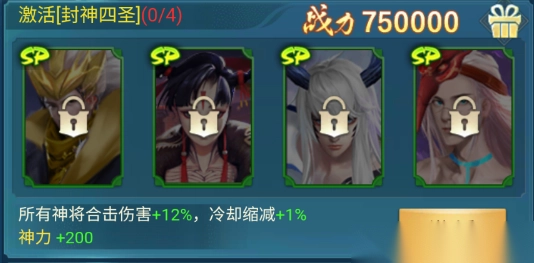 属性:所有神将合击伤害+12%,神力+100