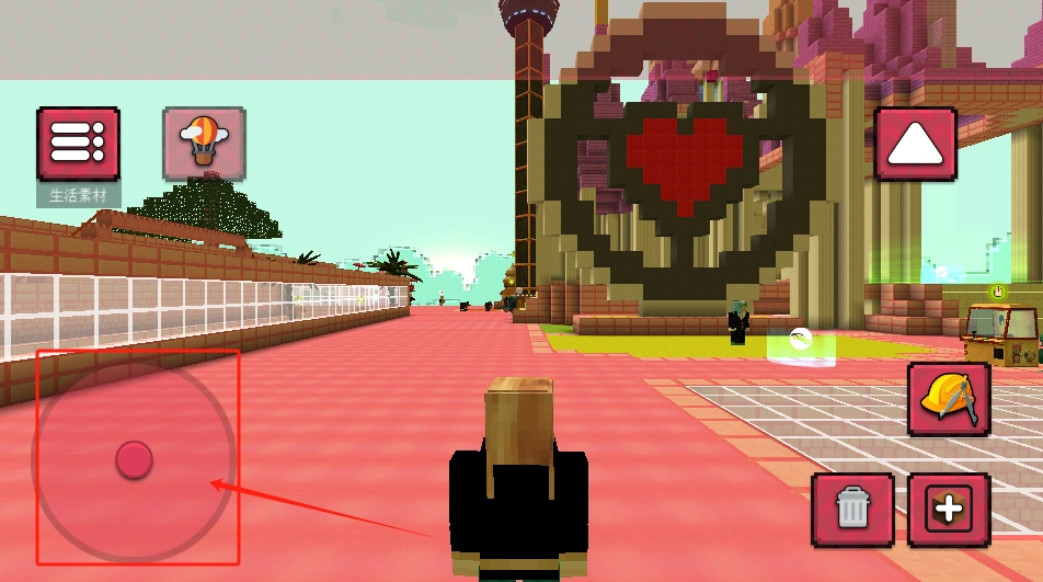 3、角色站在红地上,远处有心形建筑,点左侧生活素材选建造物品。
