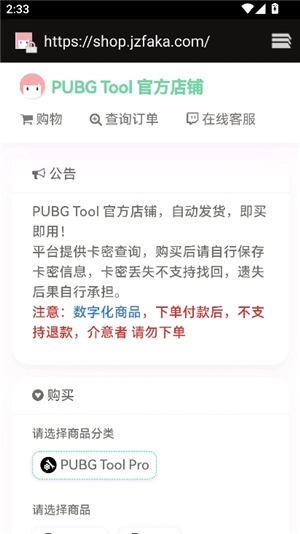 2、第一次使用的小伙伴需要购买卡密,点击跳转到外部页面,来到pubgtool官方店铺