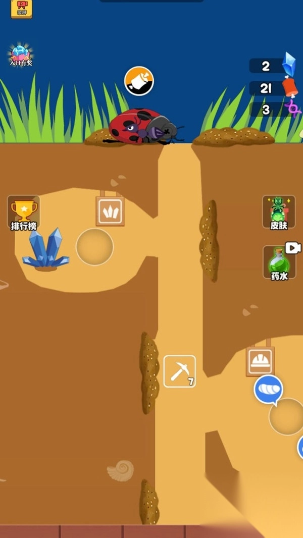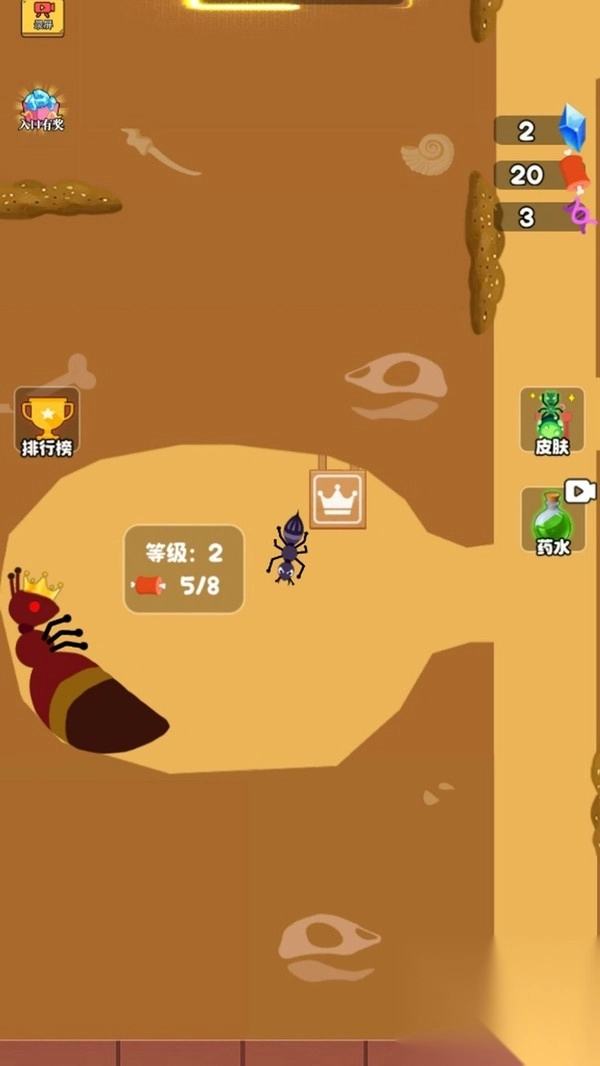 1. 通过滑动屏幕操控蚂蚁挖掘地道,途中若碰到水晶、道具便进行采集,要是挖到虫子则开启战斗,获胜后可领取奖励,持续扩大蚁巢空间。