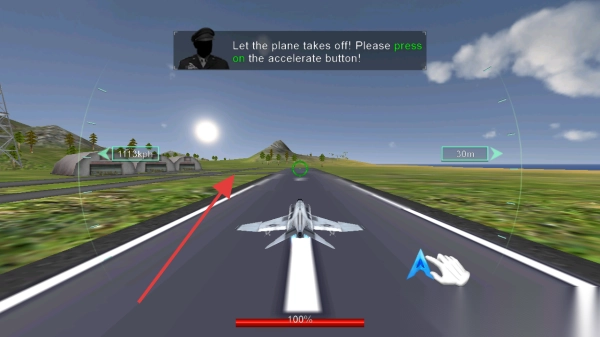 3、飞行操作场景,飞机在跑道准备起飞,提示“让飞机起飞!请按加速按钮!”,靠虚拟按键操控飞行,展现空战操作与起飞流程。