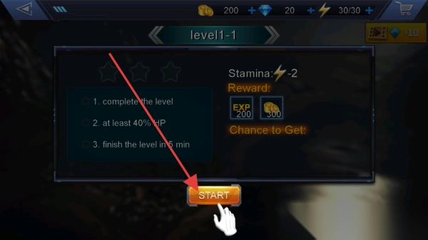 2、关卡选择界面,显示“1-1关卡”,消耗“耐力-2”,完成“经验200、金币300”奖励,点“开始”进入战斗,体现关卡推进与奖励。