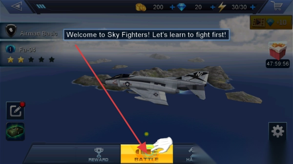 1. 在游戏主界面,会出现提示语“欢迎来到空中战斗机!先学习战斗吧!”。点击“战斗”选项,即可进入关卡。界面上还设有“奖励”“机库”等功能区域,同时会呈现飞机模型,游戏主要玩法为空战。