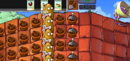 3、上方的滑动卡槽中会不断随机出现植物,你只能依靠运气,用这些植物与强大的僵尸大军展开对抗。