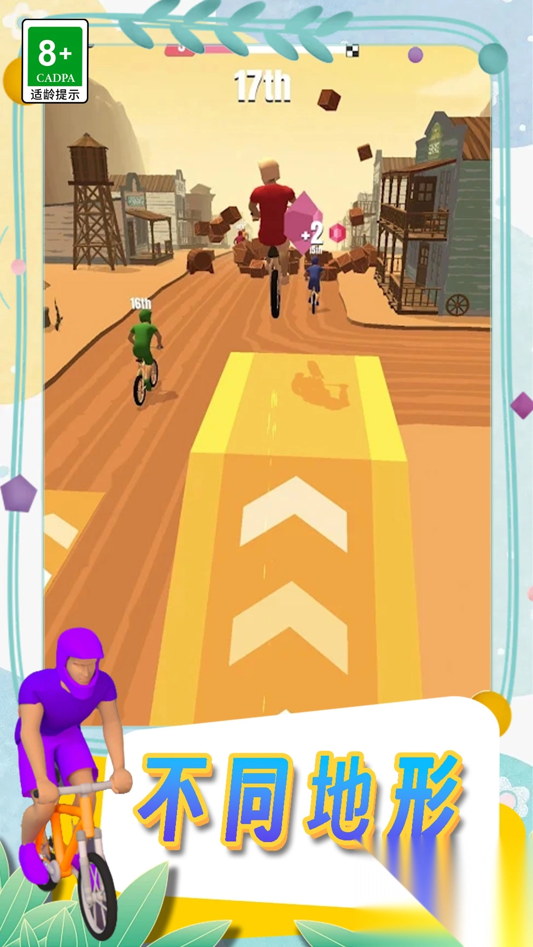 1、通过左右滑动屏幕,控制角色在赛道上灵活移动,巧妙躲避各种障碍物,保证骑行安全。