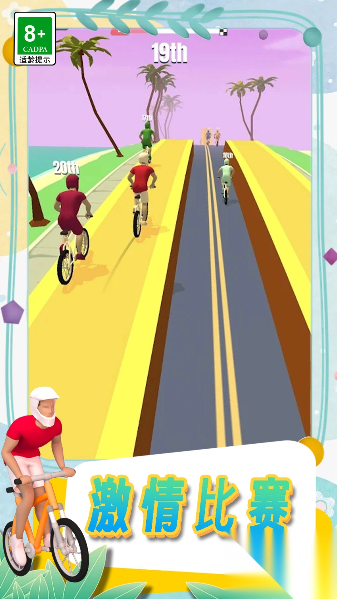 挑战自行车比赛,这是一款既好玩又简单的自行车跑酷游戏。在游戏里,你将投身于关卡比赛,与众多自行车手一同竞技。一旦准备就绪,即可操控角色,在赛道上左右灵活跳跃、闪转腾挪。前行的道路布满了各式各样的障碍物,一切都充满未知,每一次挑战都不会有重复之感,十分考验你的手速与反应能力。