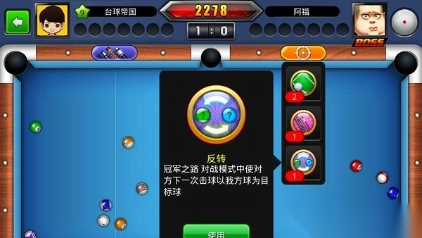 BOSS对战模式中使用,可以将一次断杆变为连杆。在某些特殊情况下适用,比如剩最后一杆清台时,需要先一杆将击球路上的障碍球击飞;或是分数已经很高了,使用后可以让评分更上一层楼。