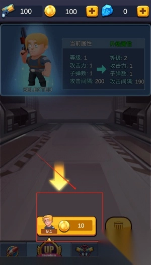 3、在角色升级界面查看当前属性,点击红框"UP"按钮消耗100金币将角色从Lv1升至Lv2,提升攻击间隔等战斗属性。