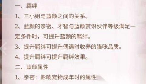 1、在《我本千金》中,宠物可通过蓝颜偶遇来获得,其品质与蓝颜的羁绊等级相关。因此,前期重点提升某一个蓝颜的羁绊,如此便能得到更优质的宠物。除了蓝颜羁绊会对猫咪品质产生决定作用外,蓝颜的亲密度同样会影响猫咪成年后的属性。