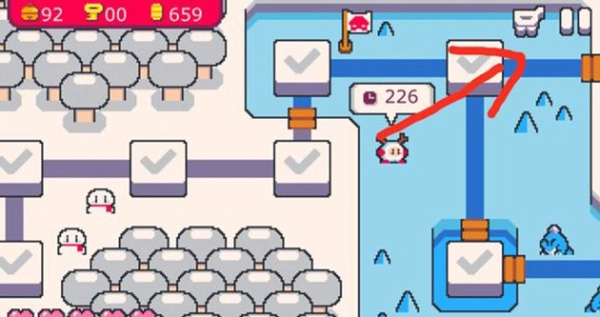 还有些地方有冰屏障和石头火陷阱,过不去的,这时候就点开商店(某些关卡也有商店),点左边最上面一个,翻到最后购买一红一蓝两只,在游戏开始时左上角“+”号处使用,红色破冰蓝色破火哦,(因为吧主铃铛都拿到了所以是浅色的)